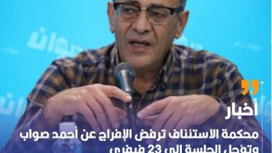 قررت محكمة الاستئناف بتونس رفض الإفراج عن أحمد صواب وتأجيل الجلسة إلى 23 فيفري الجاري …