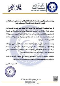 وجددت الحكومة «التزامها الثابت بمطالب الليبيين»، مؤكدة وقوفها مع «إرادة الشعب، الداعية إلى تشكيل سلطة تنفيذية جديدة موحدة، بما يحقق تطلعاته في بناء دولة مستقرة، تقوم على مبدأ التداول السلمي للسلطة، من خلال انتخابات برلمانية ورئاسية حرة ونزيهة»، كما أكدت استعدادها للتعاون مع الأطراف الوطنية والدولية كافة «بما يخدم مصلحة ليبيا العليا، ويحفظ سيادتها واستقرارها».