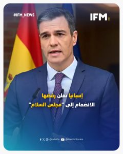 وفي سياق متصل، قال رئيس الوزراء بيدرو سانشيز، في وقت مبكر من اليوم الجمعة، إن إسبانيا لن تنضم إلى “مجلس السلام” الذي أطلقه الرئيس الأميركي دونالد ترامب حديثا، وهي المبادرة التي يرى منتقدوها أنها تقوض الأمم المتحدة.