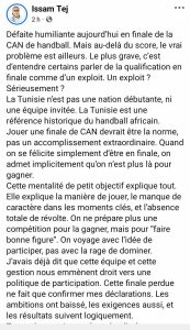 الصحفي الرياضي الكبير المتخصص في كرة اليد حاتم بن امنة اكتفى بتعليق مختصر” مؤلم ومهين ما نشاهده الان في نهائي بطولة افريقيا، لكرة اليد، سفينة تائهة دون ربان “
