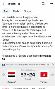 وقد اشتركت التعليقات في وصف الخسارة بالفضيحة التاريخية، فمنذ أكثر من أربعين سنة لم ينهزم المنتخب التونسي لكرة اليد بهذا الفارق الكبير (14هدفا)مع الرأفة لان المنتخب المصري اتمّ المباراة بالفريق الثاني بصفة كلية لأكثر من عشرة دقائق وكاد يكون الفرق أكثر من عشرين هدفا… ا.