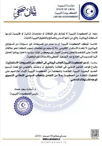 وصدر البيان في مدينة بنغازي بتاريخ 8 ديسمبر 2025، بتوقيع رئيس الحكومة الليبية الدكتور أسامة سعد حماد، مؤكداً استمرار الحكومة في الدفاع عن السيادة الوطنية وحماية المصالح العليا للدولة الليبية.